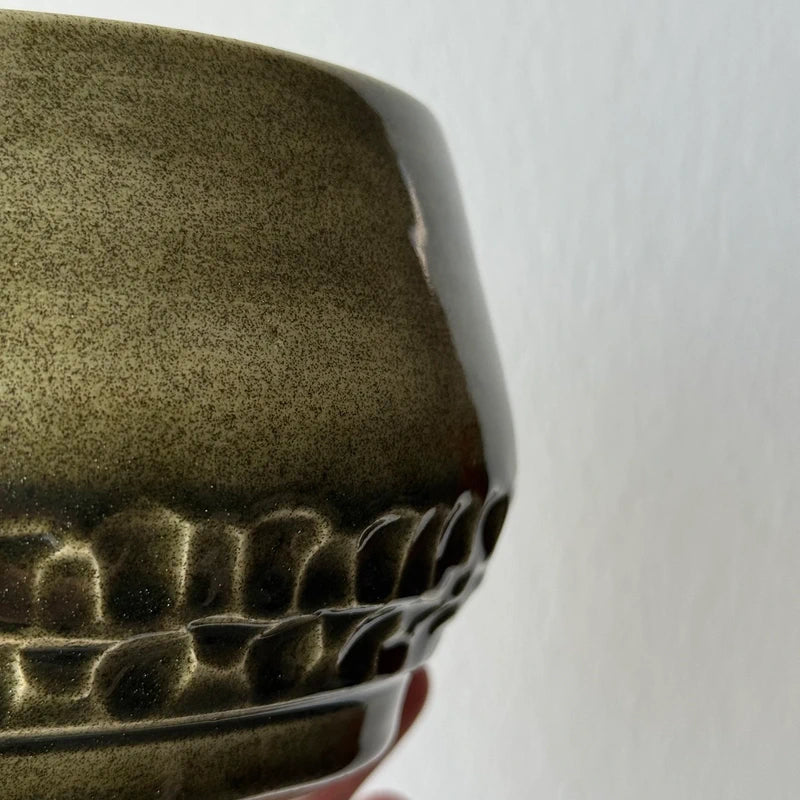 • Dettagli: Fascia decorativa con motivo a rilievo a squame nella parte inferiore. L'interno presenta un colore verde scuro intenso con visibili spirali di tornitura che ne evidenziano l'artigianalità.