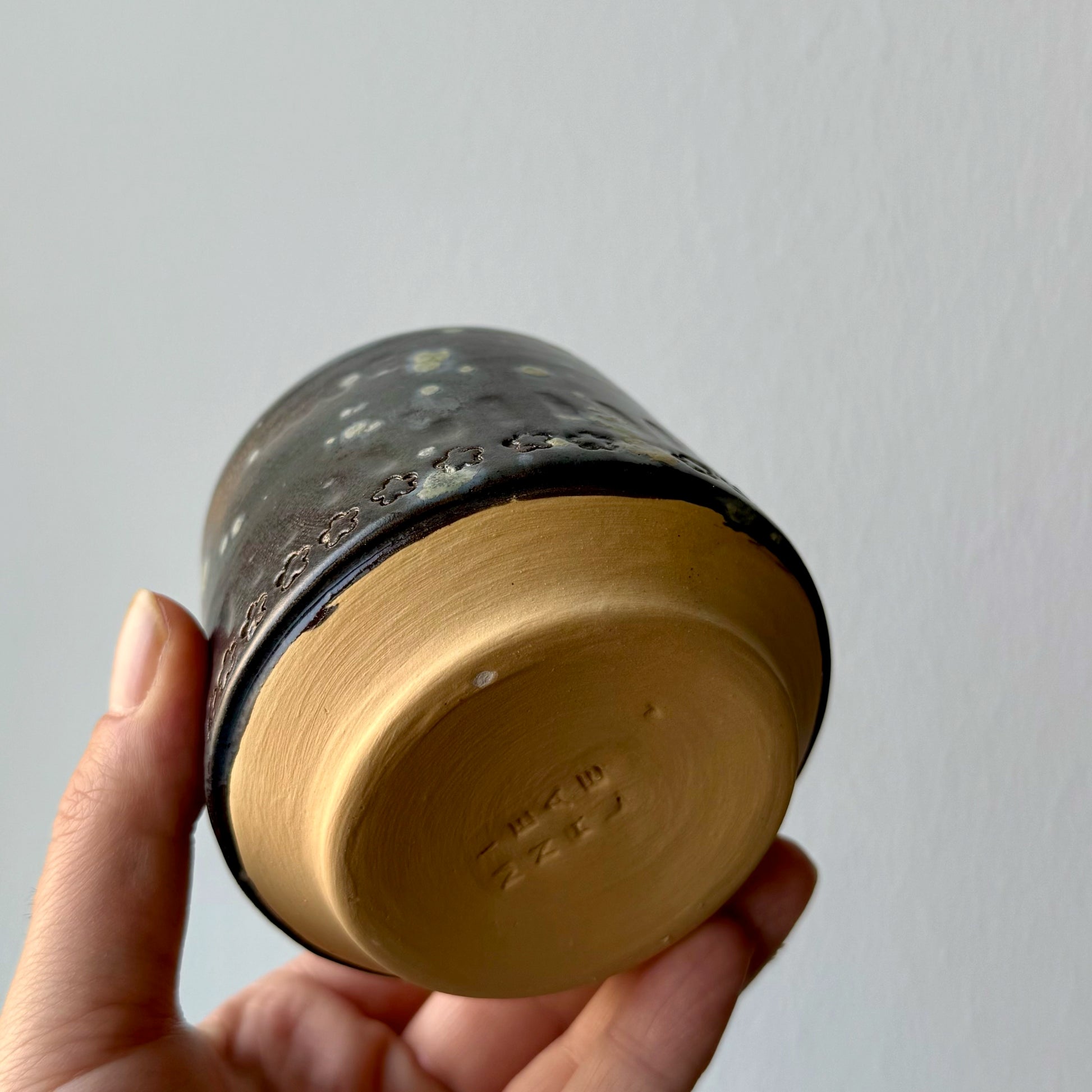 Il blu notte profondo della smaltatura crea un'atmosfera sofisticata, mentre i delicati schizzi a contrasto aggiungono movimento e carattere unico a ogni pezzo.